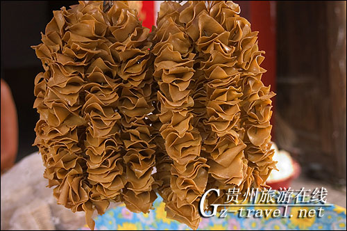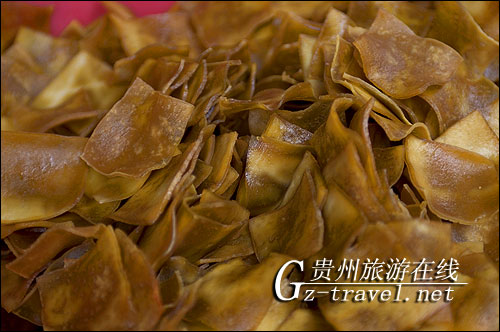 豆腐干是江口县人民的传统食品之一,色香味别具一格,制作独特。其制作过程一般要经过泡豆、磨浆、滤浆、煮浆、点浆、上箱、过卤、切块、上扦、晾干等十道工序,才能做成产品,用棕叶每百穿成一串。江口豆腐干之所以有独特的风味,主要是采取了三条措施:一是选用纯净的井水;二是不揭豆油皮,以保留其精华;三是在上扦时,首先一小块的把它移放在类似斗笠的竹箪上,晾干八成左右,再晒干或烤干,使其不起泡,也没有糊锅巴,而形成干硬、发黄、透明的方块。