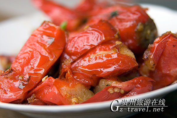 用大米面、糯米面各一半,拌上佐料、盐等,用水将米捶打成粑状形罐入辣椒,再放入坛中封闭半月即成。可蒸、可油炸渣辣椒,味道极佳。