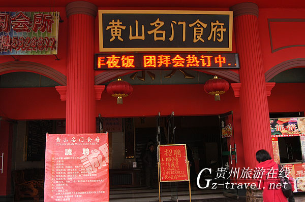 位于中山东路128号(老东门)。营业面积1500平方米,设有上档次的豪华包房及单、双桌包房。可以同时容纳400人就餐的大厅,内设停车场。前身是瑞花巷内的黄山饭店,以贵阳当地家常菜为主,在贵阳很有名气,黄山名门食府以大众消费与美味结合为特点。适合朋友聚餐、商务便餐、家庭聚会、婚宴酒席。环境幽雅、装饰考究、步入店内有回归大自然的享受。