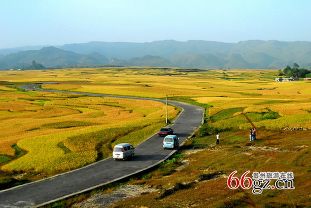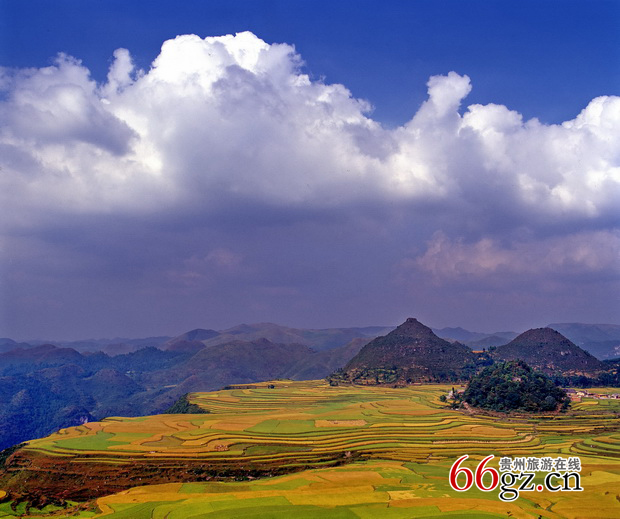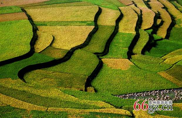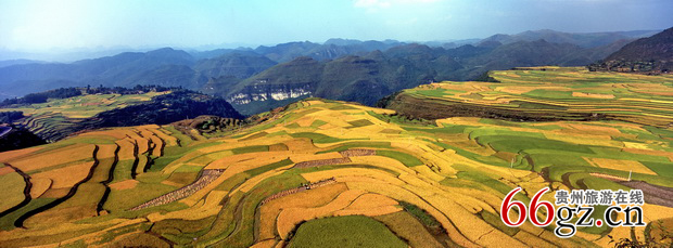 高坡梯田位于贵阳市高坡乡,距离市区有50多公里,是一个海拔在1500米之上的苗族乡镇,这里居住生活着苗族、布依族、汉族等民族。高坡乡地势独特,正如它的名字一样,整个乡村散落在一个渐次升高的山坡之上,山谷中隆起很多平台,四面则是峡谷深埋,为典型的喀斯特地貌。秋天的高坡,一派金黄的世界。