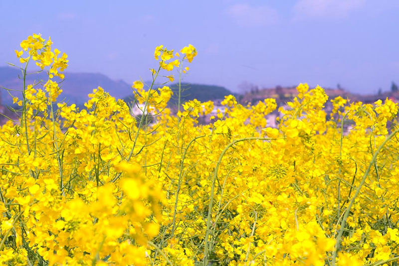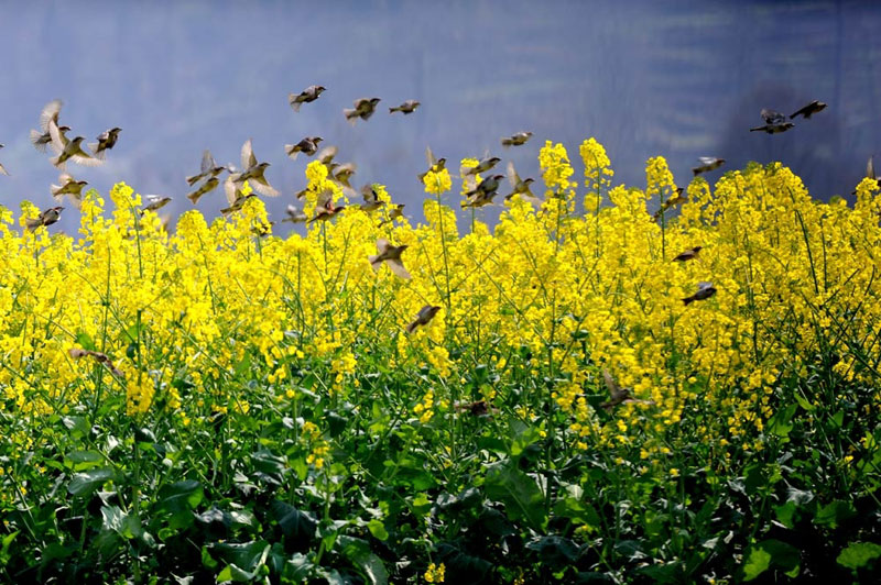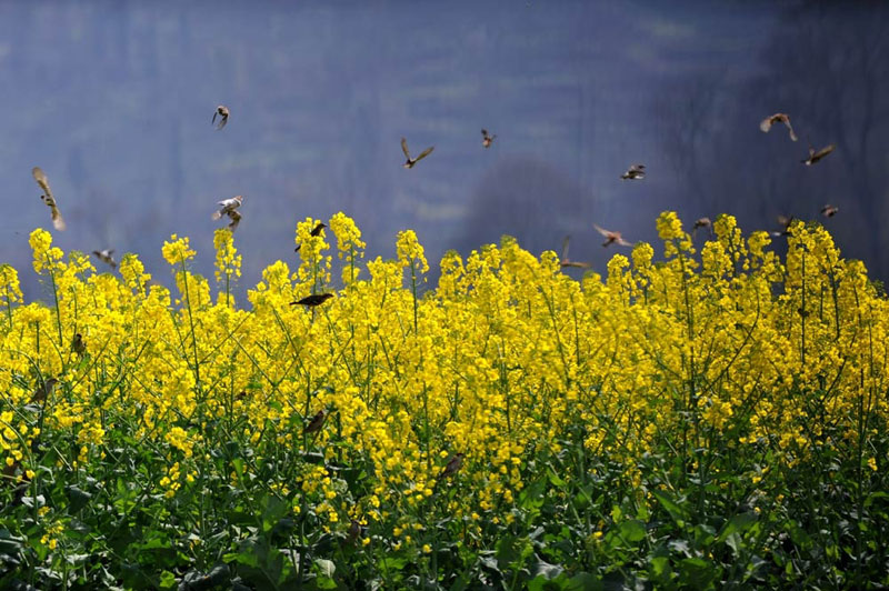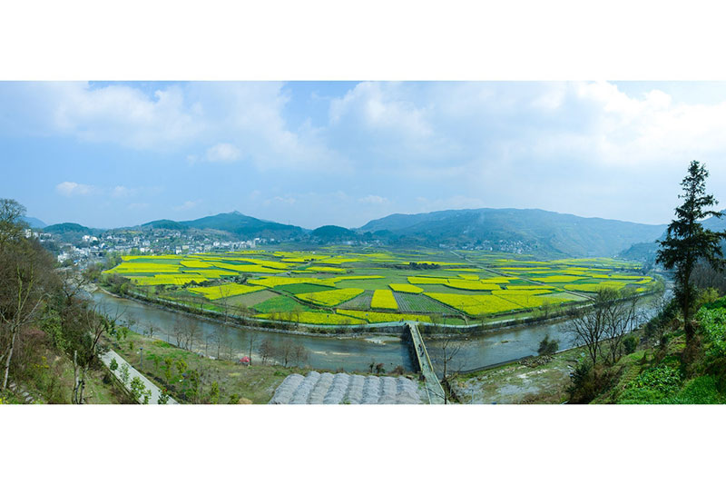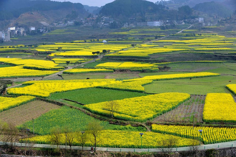 在贵州省开阳县禾丰乡,层层叠叠的梯田里油菜花开,形成一幅幅美丽的画卷。十里画廊八大画面之一的底窝坝,有着“中国油菜花第一弯”之称,这块由河道冲刷沉积形成的小盆地,青龙河环绕着形成一个直径半公里多的“U”型大拐弯,犹如河水在此伸了一个优美的懒腰。大拐弯内大片的油菜花,弯外青翠山峦,登高而望,风景壮观。