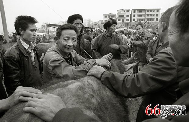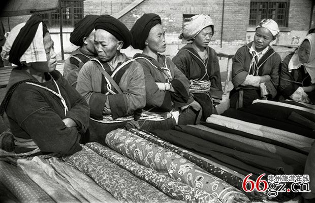 龙里中排苗族妇女到高坡赶场,在布摊前徘徊。拍于1980年。