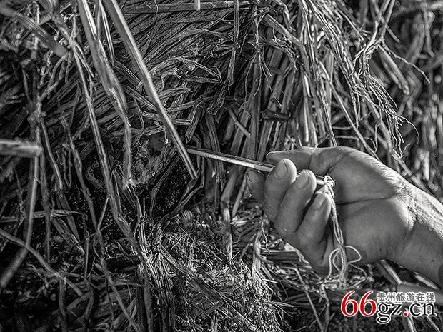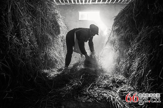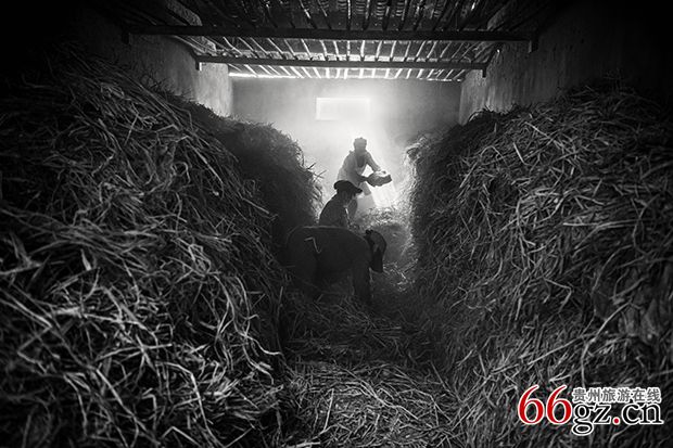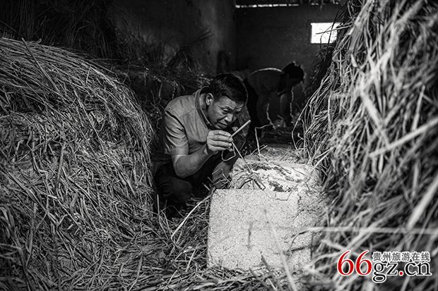 《翻仓》大曲在发曲仓里发酵适宜后,要进行一次翻仓,翻仓时人工会惊吓到生活在曲块里的小生命,只见微生物密密麻麻的飞来飞去,人工拨开稻草,将曲块翻转堆砌排放,盖上稻草继续发酵。