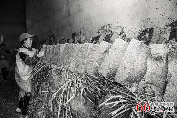 《大曲入仓》--踩制成型的曲块按“三横三竖”的阵列方式摆放,曲块与曲块之间用稻草隔开,密闭发酵。