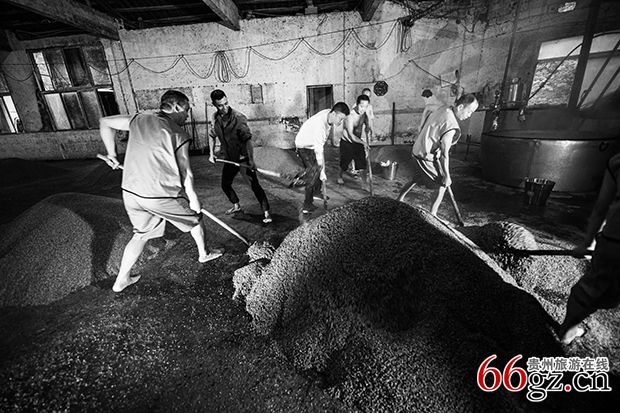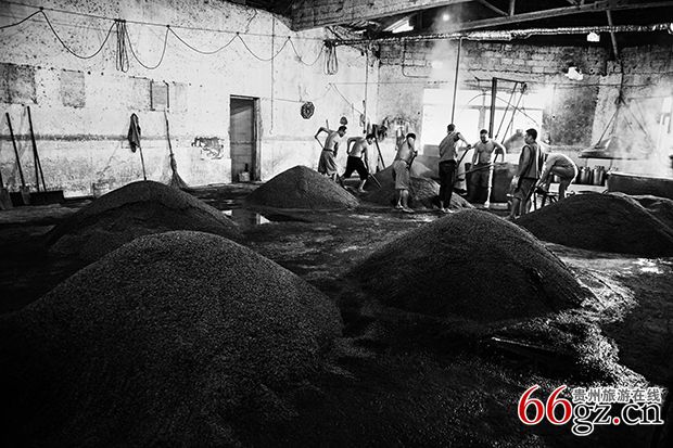 《翻沙》高粱加入开水后,迅速搅拌翻造,多人协同,让生沙在科学的时间内均匀吸入水分,这是一个力量与技巧的完美集合。