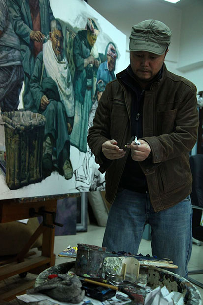 近几年,彭承军在画风上有了一个转变,从人物到风景。他的风景画也尤为特别。他不是太喜欢那种透视准,光线正常的事物。他喜欢在真实的事物里附加自己的一些情绪在里面,而并不是完完整整的照搬某个人物或事物。尽管真实给人的感觉很接地气,但如果不加点个人情绪,那就不是彭承军。在他已完成的《拆迁户》作品中,就是一种旧得掉了一地时光的调子的代表作,那是有一天他开车路过一个地方,恰巧有一幢楼正在被拆迁,落日的光影折射到这幢楼上,一种惨败的情感立即袭上心头,彭承军赶紧用自己的卡片机记录了这一幕,当然最后他还是倔强的去相馆让师傅加了色(笑)。 “我特别喜欢那种支离破碎、残破、惨败的感觉。不喜欢高楼大厦,也不喜欢高端大气的玻璃墙。” “可以说,你的性格深处是忧郁的么?” “忧郁,我不承认,但也不否认。不发表任何意见。(笑)”