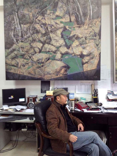 “乱一点好。”这是指彭承军的画室。其实彭承军的画室相对其他画家来说,还不算太乱,至少板凳和沙发还是可以腾出空挡坐下来喝杯茶闲聊一番的。在彭承军的画室里,放置着各个不同时期的画作,可以想象在平时他的创作多么用功!他很腼腆,也非常客气,“不好意思,太乱了,只能将就了。”“没事,真正的艺术家都是在苦难中成长起来的。”听到这句话,他又有些腼腆的笑了。 当你和一个画家初次见面,他的画室一定是避不开视线的。可以说画室是一个画家灵魂的房子,一盏日光灯挂在天花板上,在灯光下,画面展现出柔和的色彩,反射出含糊而闪烁不定的光泽。画架上摆着一张大画,是一张有情绪的风景画,这是彭承军最近在创作的一幅名叫《春分》的作品。笔触浑厚,恣意挥洒,色调清雅,就像钢琴在轻轻吟唱着一首家乡的歌谣。新鲜的油画散发出松节油和亚麻油的芳香,混合着烟草的气味,浓浓的,韵味十足。