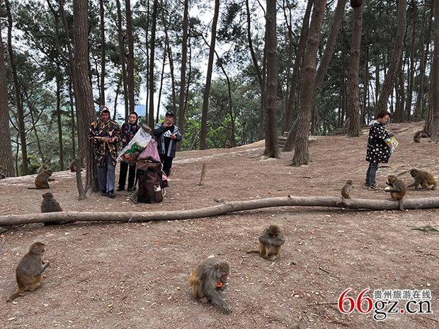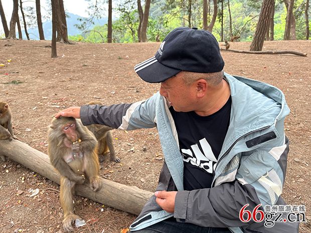 交流在给猴子投食中热烈进行。原来,此前我遇到的阿姨是李师傅的嫂子,她到黔灵山喂猴子已10多年,李师傅退休后就加入了投食者队伍;张、文夫妇是过去陪老母亲上山,有20多年“喂龄”的老人家83岁了,便把接力棒交给了儿子、媳妇;旁边一位季姓帅小伙是无锡人,两年前到贵阳市花溪区的某航空工业单位工作。他认为贵阳中心城区有个大型综合性城市公园、国家AAAA级旅游景区黔灵山公园,而且散养大量野生猴子,在全国可称唯一,真是大自然的特别馈赠。他特别享受黔灵山的自然生态环境和清新纯净的空气,更欣赏猴子的灵性和聪慧。每周休息天就带上买好的食品,一大早坐地铁来黔灵山喂猴子,完全彻底放松休息。中午下山随便应付下肚子,再买些食品上山接着喂,和猴子相处一整天,傍晚才下山回花溪。