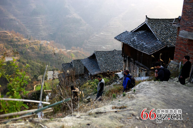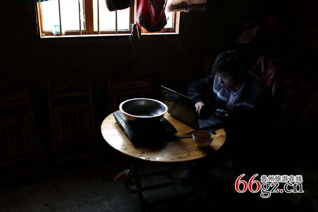 2014年1月21日这天,我有幸随同贵州旅游在线“送福到家”拍摄“全家福”、送春联公益活动组一行六人,从从江出发,沿321国道途经广西三江地区的梅林,转道从江贯洞,再从贯洞分路,沿着崎岖的乡村公路来到庆云乡。这段乡村公路可真难走,从贯洞到庆云乡,全部为土石公路,有很多路段还仅仅是毛坯路,坑洼不平,12公里路程,我们足足花了一个多小时的时间,到得庆云已近中午,草草吃了中午饭,便在庆云乡政府所在地的寨全村为当地侗族村民拍摄全家福。刚把照片打印设备铺开,村民们便闻讯从四面八方聚拢过来,摄制组工作人员又是拍照、又是打印装框、又是发送春联、袜子、毛巾、手套等,忙得不亦乐乎。眼看时间已近下午五点,我们还要赶到佰你侗寨看望采访石奶引,只好赶紧收拾行装,返回岔路口直奔佰你侗寨而去。从岔路口到佰你,不过6公里路程,但这段路程更难走,与其说是乡村公路,不如说是羊肠小道,我们的车就像蜗牛一样在小道上颠簸爬行,人坐在车里左摇右晃,同行的人把这段路称之为“按摩路”,虽然有些讥讽的味道,但这比喻还是蛮贴切的。到得石奶引家,已是下午五点,站在公路边抬眼望去,寨子四周是层层叠叠的梯田,几栋民居错落于梯田之间,太阳西下,把整个寨子和山野映照得火红火红,静谧而祥和。