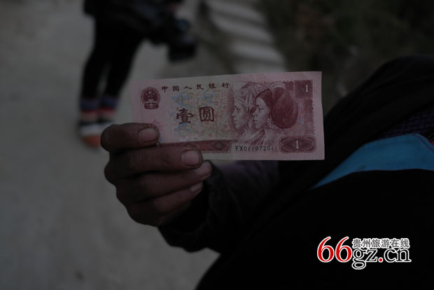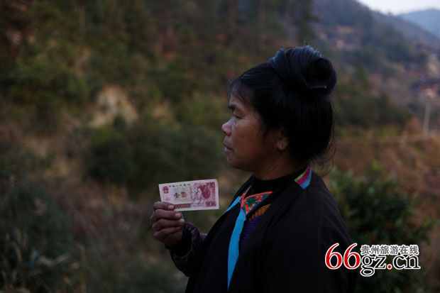 当我问及是哪一年哪一个人给她拍摄的照片时,石乃引笑了笑,用侗语回答说记不得了。经过从旁了解,大约是在1978年,16岁的石奶引和伙伴们身着盛装,去从江县洛香镇赶集。熙攘中突然有人从背后拉了她一把,石奶引转头一看,是个满面笑容的陌生中年男子,他旁边还站着两个人。该男子示意她脸朝侧面站定,举起相机连续拍了好几张,拍完后,男子转身走了,没有给石奶引留下单位、名字,也没有留下电话,直到这张照片经过这位中年男子在照片的基础上经过二度创作,最后被选中印刷到1980年第四套一元面值的人民币上、1987年发行并流通,才有人告诉石奶引,她的影像印刷到人民币上了。石奶引拿着这张一元面值的人民币,心里真是高兴,一时不知说什么好。这以后,陆续有很多记者上门采访拍摄,但都没有给石奶引留下照片和任何联系方式。我想,这也许就是我们刚开始采访时所见到的石奶引脸上的凝重表情的原因吧。还好,这次采访,我们没有再让石奶引失望,回到贵阳后,贵州旅游在线的工作人员及时将采访中拍摄的石奶引家的“全家福”照片打印了出来,并亲自送到从江县旅游局,请旅游局的同志及时转交给石奶引,了却她的多年心愿。