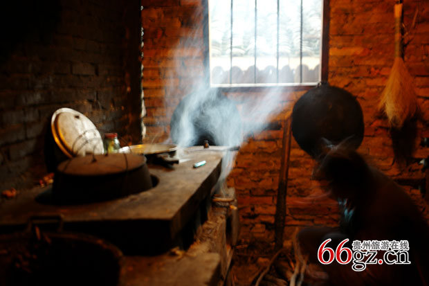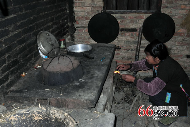 采访结束时,夜幕已然降临,石奶引来到柴火垛前,取下几根干柴,准备生火做饭,我们跟着石奶引进了厨房,里边黑洞洞的,什么也看不清楚,这时,她丈夫走过来,打开了电灯,电灯光很微弱,光线还是很昏暗,石奶引好像早已习惯了,只见她麻利地蹬下,她丈夫取出松明子,点燃后递给妻子,妻子将点燃的松明子送进灶孔,瞬间,浓烟夹着火舌从灶孔里冒出来,笼罩了整个厨房。