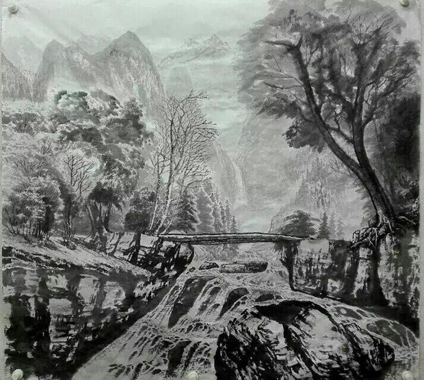 故乡的独木桥(水墨国画)