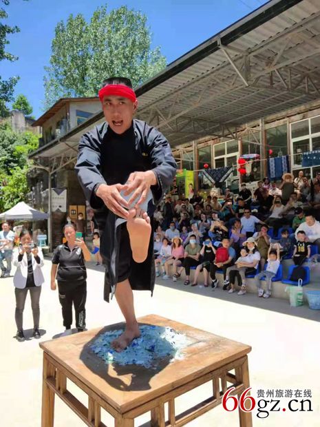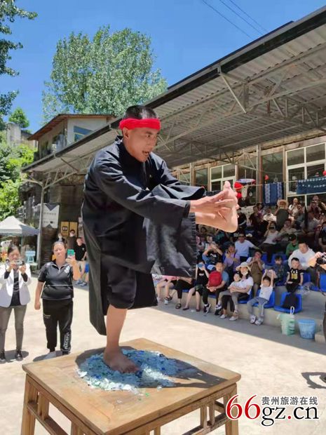 2021年6月6日至8日,秦礼军掌坛师在花溪夜郎谷为游客展演了傩坛绝技“光脚踩碎玻璃”“吃碗”。通常,若某人久病缠身,茶饭不思,多方医治无效时,傩法师就会根据病患之生庚推算,若认为失落了“三魂七魄”,则采用上述傩坛法术以祛邪治病。