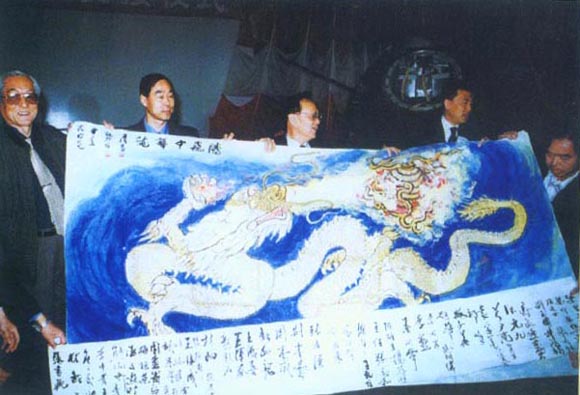 《腾飞中华龙》巨幅国画,2002年4月5日,从“神舟”三号飞船返回舱里取出。图为 作者龙黔石,王挥春和航天部领导、航天科学家合影留念。 |
