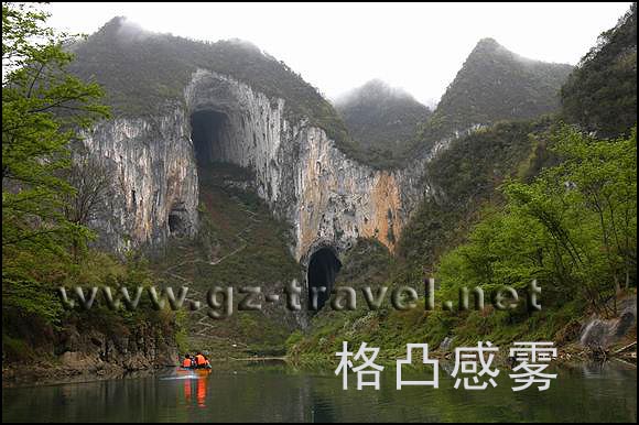 另一次,领略格凸迷雾的风采是在格凸河伏流入口处的南天门景区,那次我是同省里搞规划的专家进行实地考察,我们去得很早,到了南天门景区也只不过是九点来钟,雨过天晴,格凸又起雾了,雾模糊了所有的的山峰,犹如一个个披着灰白色轻纱似刚出浴的美女,诱惑着你的激情,诱惑着你的兴奋。灰白的雾气从高于地面二百多米,宽七十多米,门高八十多米的南天门不断涌出,二十分钟之后,一束金灿灿的阳光又从南天门喷射而出,直射在美女山上,印证了“美女梳妆明镜照”的传说。成千上万的格凸鹰燕穿梭于金灿灿的了阳光之间。南天门的神光消失之后,我们坐上老黄的小舟进入南天门之下的艳阳门。在高一百一十六米,宽三十多米的巨型拱门之下,人在其中,顿觉妙小,洞内高旷空幽, 气势恢弘,难怪专家称这是世界上最壮观喀期斯特门厅。进至百米,原来在南天门消失的阳光,神迷地在这里出现。这不是虚幻,也不是梦,它实实在在在格凸出现过。阳光移至通天门从洞口直径二百多米,深三百七十多米的世界上最深的竖井中斜射下来,穿过水帘形成数道彩虹,照着“毛主席去安源”。通明辉煌的燕王宫,无数只燕子上下来往穿梭畅游,几缕变幻莫测的轻纱薄雾飘游其间,洞内因为有顶光、侧光和逆光的作用形成了明亮与昏暗、清晰与模糊、素描与色彩的鲜明对比,真叫人感慨万千,心旷神怡, 赞不绝口。我攀登上洞中从通天洞蹦塌下来的巨大而高耸的岩石上,欲抓住彩虹,欲披薄雾轻纱,却怎么也够不着,我发疯般跳跃挥臂,雾伴我而舞,虹架天桥,可我就是上不了桥,披不上轻纱。眼看如此美洁之物慢慢飘逝,我心中不舍,意欲追随它去,却险些跌下岩石,方惊吾乃尘世凡躯,须臾离不开足下石土,遂茫茫然不知所以。只可惜这幕奇特的气象景观,随着地球的自转,光线的移动, 不知什么时候,眼前的彩虹,游动的薄雾魔幻般消失,然而格凸美景犹如昙花一现,留给了多少游人之遗憾。