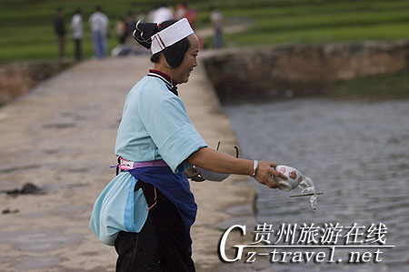 九溪村位于安顺市东南隅,距市区20余公里,是安顺市最大的屯堡自然村寨。这天十里八乡的屯堡人聚集在九溪参加河灯节。