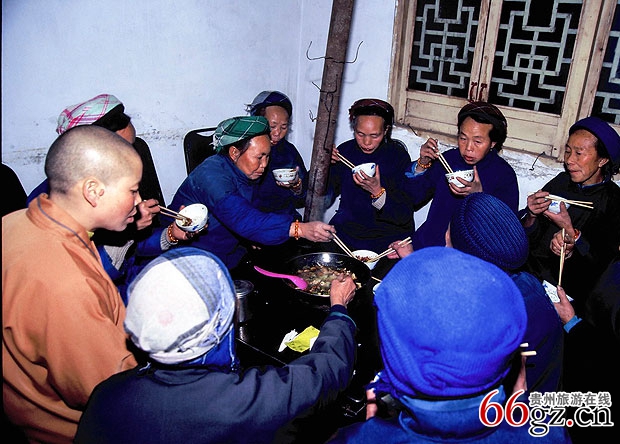 云鹫山灵鹫禅院里面,朝山的信徒在吃斋饭 李立洪摄 2002春节初八夜