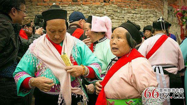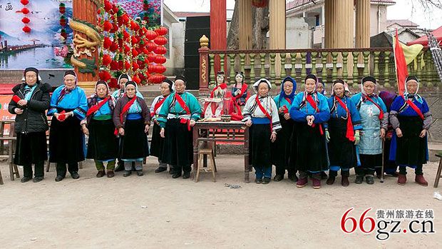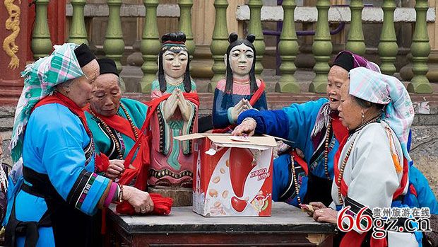 狗场屯“老佛头”,“老佛头”指屯堡村寨中上年纪和修佛的妇女。“老佛头”在屯堡村寨人数众多,她们信佛修佛,信仰虔诚。每到会口都要去朝山拜佛。修佛为家人修,为自己修,为老人孩子修。用佛家的善与恶和因果观约束自己的行为,教育自己的子女。