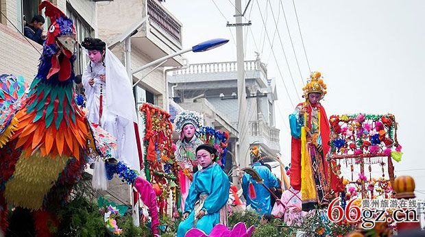 按神话传说和侠义英雄故事准备的亭子彩车,演员皆由村里小孩扮演