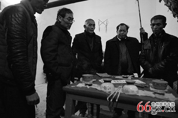 4、“朵少然”(布依语),布摩诵“起事经”,孝男和孝女分别跪于灵棺前面和后边,即亡人棺材的左男右女,静声听诵,用小猪仔摔打三下,必须三下摔打死,不能用刀具杀。操作者必须为异姓外人,此人至打今日起专门为主家替代服务布摩的,此人称为“亚布摩”,直到斋事办完成为此,。孝家另设一异姓外人来替代主家做早晚供菜,同样到斋事完毕,做素食,用菜油做菜。