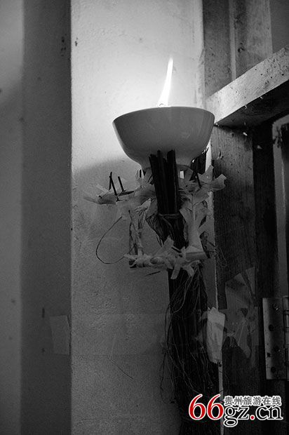 ⑨点当(点灵房灯): 孝家行事同⑧一样,布摩将准备好的油灯碗,香,念完除邪经,然后孝子按照布摩引示动作效仿,由布摩念镇邪咒置放在灵房内,有几棵鬼杆点几盏灯,布摩默念供经,念毕,鸣金,鸣炮,吹唢呐,孝家子女哭丧。由布摩念镇邪咒,燃点长明灯,按亡人鬼杆数点盏数,念除邪咒封灵房门,此灯昼熄夜明,直至完事。