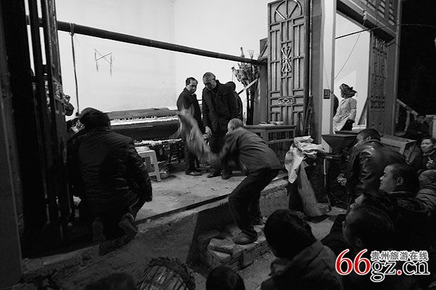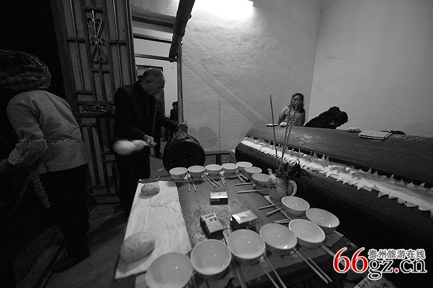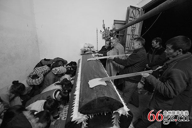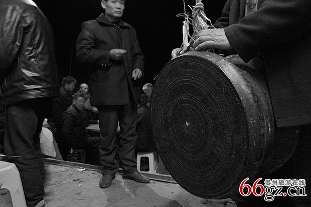 3、悬吊铜鼓,布摩默诵八卦镇邪咒语处理后才将绳吊在棺材尾方前,即孝堂进哀门。