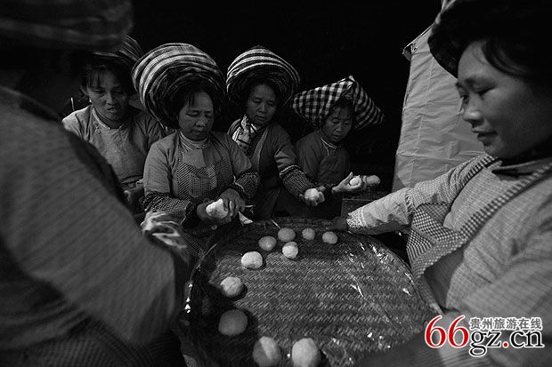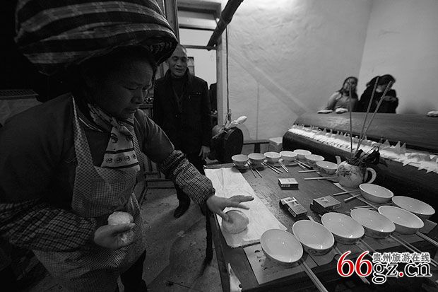 7、孝媳蒸好糯米来用木质盆哉装在灵棺前,先由孝子跪于地手持木棒打三下,边打边敬请亡人来品来尝。此时孝方,孝女在哀跪位置,再由亲友协助打成糍粑,然后孝媳提三个放在灵棺的头中尾及数个置放在以竹筒代替的茅人棺材上面祭供,哭丧。每天晚上打一次糍粑,直至完事的前一晚上。