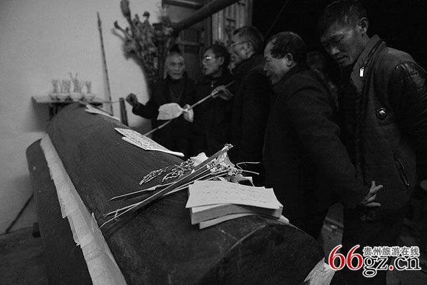 5、摩闷:请寨中有管理和接待水平的异姓外人2人和布摩闷的布摩,用长刀站在棺材左边,脚踩剽杆,直立不动,按照做闷的布摩暗示动作效仿行事。此段开始灵堂孝男、孝女按前所述跪叩方位,静声勿扰,跪候布摩做闷经,外边由孝媳等众人作好碓,磨,唢呐、长号,地炮,烟花等准备。灵堂吊铜鼓由布摩定好子午方位待击,“摩闷经”完毕暗示,由打猪人用一根拐杖到灵堂外幡旗杆位敲打竹槽三下,回身步入灵堂,一只脚在门外,一只脚踩在门槛上高唤三声“叽”就进堂,立即鸣金,堂外的同时鸣放地炮,碓,磨等一起响起···
