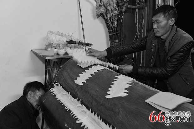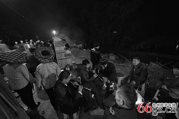 6、安凳灵房:灵房是由“砍嘎”的女婿称“马郎客”送来,起事前必须送到孝家待用,还有骑马抬轿,金童玉女等模具,敲锣击,众人聚队相送,孝家要热情相迎,同样边准备吹乐,提酒烟迎接,“马郎客”送来的灵房要用八仙高桌来按放置在堂外,等待诵经完毕后由布摩移放在堂中事先布置好的位置(棺材头位同时将亡人魂饭摆放台前)。