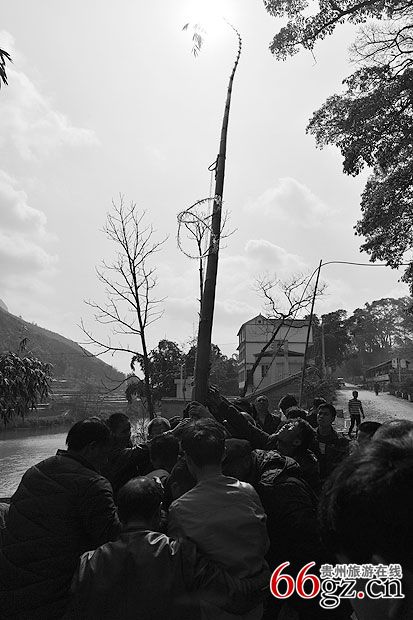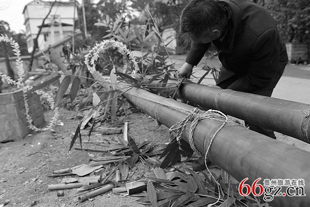 1、选立幡吉日吉时进行仪式。孝家邀请寨邻亲友相助出力,孝家男、女、婿要备酒、菜、香、纸、硬币、火炮、烟花、吹唢呐、长号等一同到斑竹林中选竹子。选竹的要求要青枝绿叶,尖稍不能秃顶,竹表皮光滑,从脚到尖光滑无损,节道清秀。