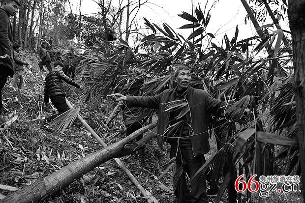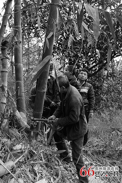 2、幡杆选定后,孝女将备好的酒、饭菜等祭贡竹丛,点香、烧纸。祭毕,孝子动刀砍3下,众亲友们帮助砍倒放下,当砍下时,用硬币放在刚砍下的竹庄里,立即吹奏乐器,鸣炮,放下时必须小心不能与另外的另一颗相碰,以免檫损坏表皮,不能放下触地,众亲友列队扶在肩上送回,到家时用高凳子垫放,孝媳用新孝布檫抹。如立多棵用同样的方式进行。