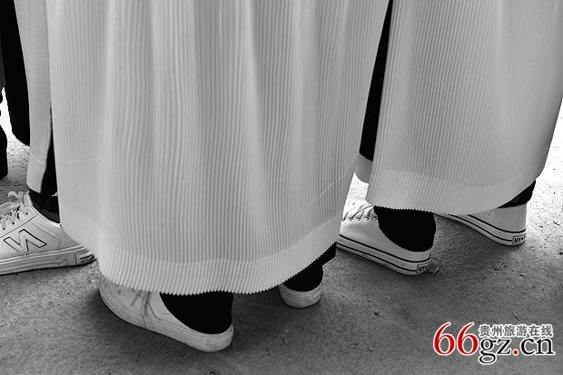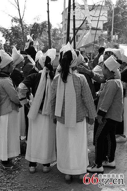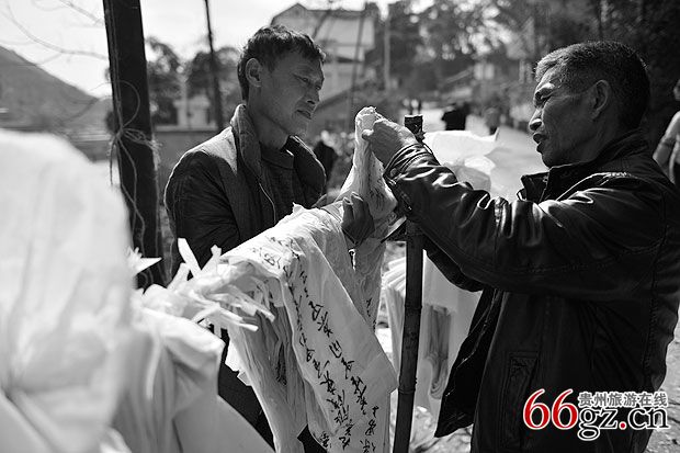 4、孝子的内亲送孝衣在立幡后即可进行,送孝衣给孝子,跪在鬼杆脚,由外家亲人为其披衣戴帕,白布制作长袍孝衣,穿白布底鞋。