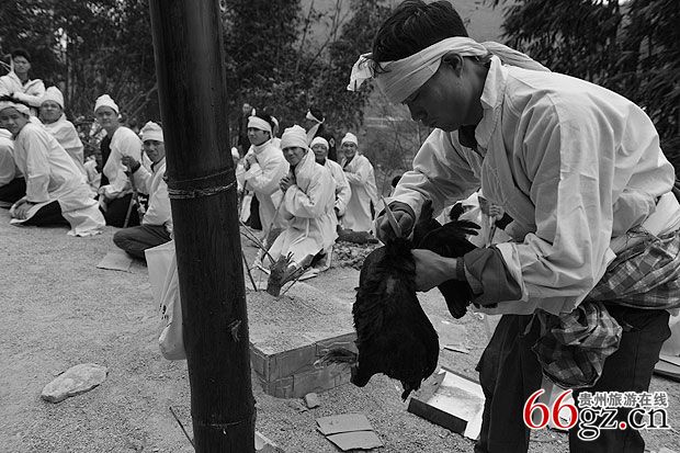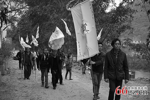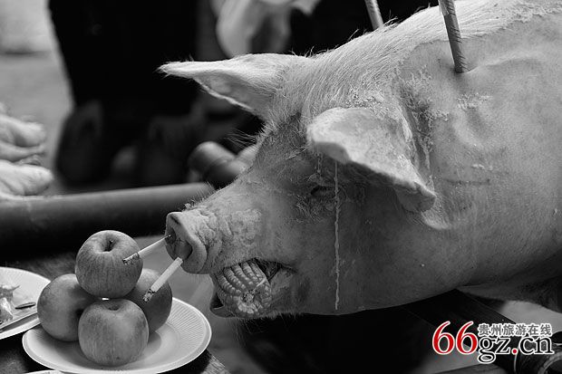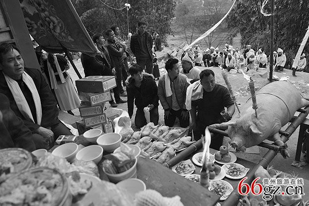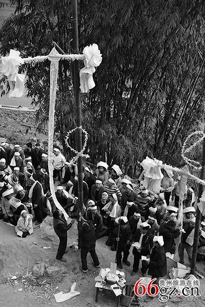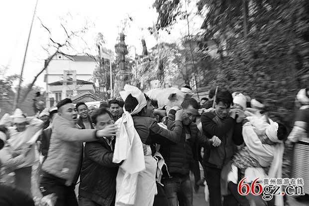 3、“马即客”。 “马即客”是灵堂中新故亡人之长女婿或最小的女婿,邀约百号以上众人结队。备齐清纯引吊花幡旗伞、纸马、供品、砍牛用的屠宰刀具、横刀。一把穿插用于次日在鬼场中拴牛的丈余长挽成圈的老鸦腾由一位强壮有力的汉子扛护,另一个强汉藏一瓶马郎酒,由体力强悍的一群青年抬一头祭供的大肥猪(脊背尾留少许毛,嘴含一包玉米棒,鼻孔插两支香烟,),此时孝子们竭力抢“马郎酒”、横刀和老鸦腾,折腾抬祭供猪的担夫,无论怎么折腾,马郎客众人主要护送好担抬肥猪的人,不能随意放落于地,要鼎力冲过难关到灵前安稳放在事先准备好的高凳子上,要等到任何一方将马郎酒抢来放在灵堂交给布摩处,横刀连老鸦腾也同样意思。孝家和马郎客双方在展示能力,马郎客要强夺吃替代亡人躯体的牛肉,孝子为保护先亡的躯体免受蛮人残食而鼎力掩护驱赶退回,用牛代替亡躯。马郎客进孝家,必须要等候酸汤客先完成扣奠仪式,孝子送到安排店家妥善方能启动进场仪式。凡是敬孝的媳女都到备花色纸伞来祭奠守孝。