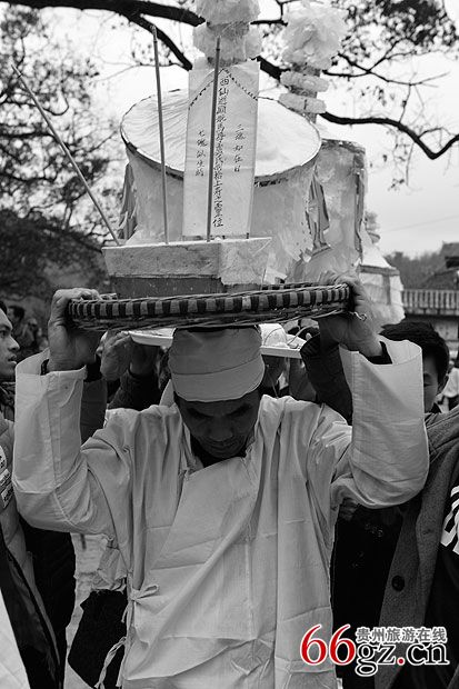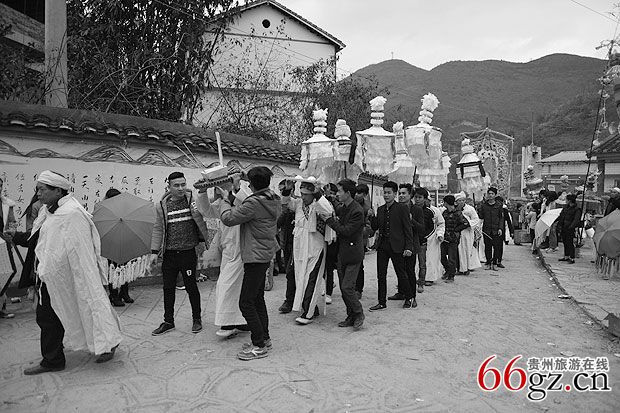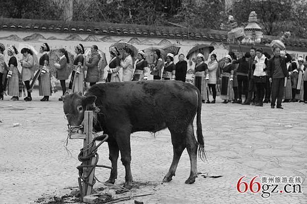 此问砍牛女婿同时在灵堂布摩处取拴牛腾和牛鼻绳麻,牛桩,先用布摩在鬼场把牛桩载在场中,拴好牛,布摩念完“定转场经”回到灵堂。
