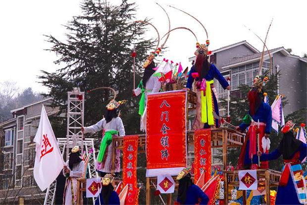 演员们额上戴以简炼夸张的脸子即木雕面具,身着长衫,背插小旗,腰系战裙,手持木制短刀长枪,唱着原弋阳腔,仅借一锣一鼓的击奏,在一人启口,众人接腔的伴唱下,以人物上下更换时空变换,借三、五步为万水千山,就竹鞭为金戈铁马,依桌椅象征高山要塞,在扬、开、合的厮杀、挡、架、翻、窜的格斗中虚实结合,形神兼备,产生极具击鼓进兵、鸣金收兵的古代战争景象,从而形成屯堡地戏特有的艺术魅力,被称为戏剧史上的活化石。