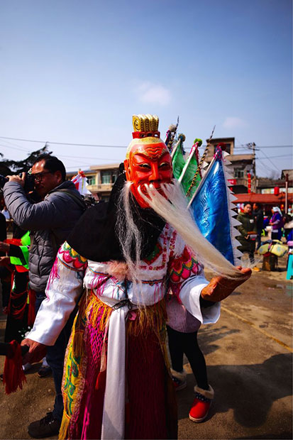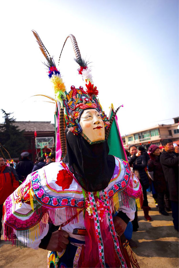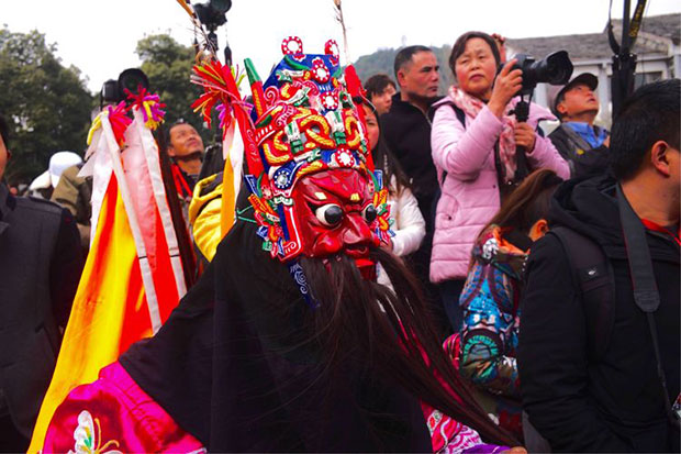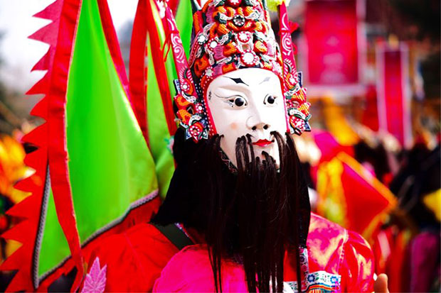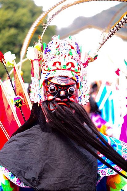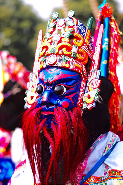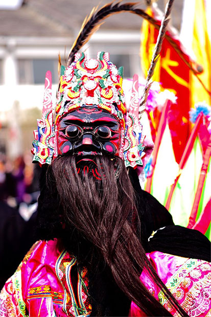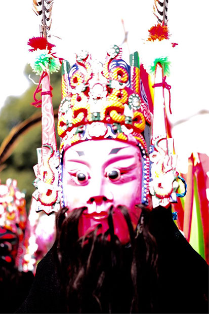 面具的用色比较讲究人物的性格特征。按雕刻艺人的话说"要跟书走",书中对人物的描述是什么性格,就要用艺人们心目中性格化的颜色来表示。以单色论,一般红色代表忠勇(如薛仁贵),黑色代表刚烈(如张飞),蓝色代表果敢(如单雄信),绿色代表稳沉(如尉迟宝林),白色代表英武(如马超)。另外,书中对人物脸相的描述是什么颜色,或者内涵情节因素,用色上也必须"跟书走"。如脸若重枣的关羽用红色,性如烈火的黑炭头尉迟恭用黑色,脸似金妆的余化是金,,因与尉迟恭争当征东元帅举石狮累得吐血而病倒的秦叔宝,自然就要用黄色代表了。若单色加上对称的花纹,那就是反将了。