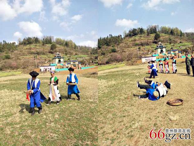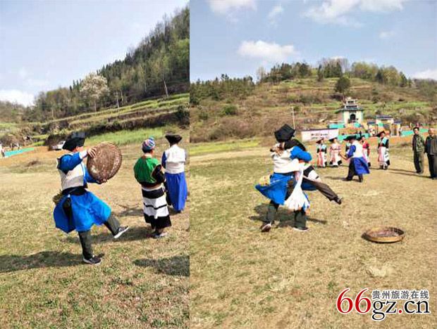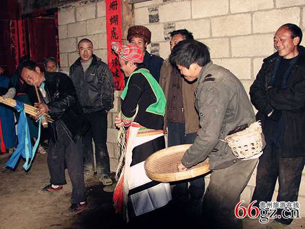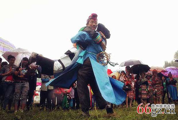这个“男女摔跤”舞是在束供竹王偶像中举行的一个程序。““竹王偶像”束好后立在一个竹簸里,请竹王老祖公坐堂屋神龛中间看子孙们表演活动。在堂屋里举行摔跤舞表演,摔跤舞3人组成,一男人吹着芦笙走在前面,一女〔男扮〕走在中间,边走边捻麻,一男跟在后面,身挎一竹兜(牛嘴笼),竹兜里装着稻草,两只手端着一竹筛跟在后面,边走边舞。男的用竹筛去处走在前面女人(男扮)的屁股。处第一次女的侧过头来对男的说:“不要开玩笑,我忙捻麻,”处第二次女的侧过头来对男的说:“不要开玩笑,我忙捻麻,”处三次,这个女人火了,调转过来对男的说:“等老娘来瞧你哈。”男的把竹筛放下,两个抱起就摔起跤来。摔跤舞要摔三次,其中:女的要倒两次,男的只能倒一次。如扮女的劲大摔不倒下去,站在旁边的都要帮忙男的,伸手去拉女的脚,观看的男女老少哄堂大笑。