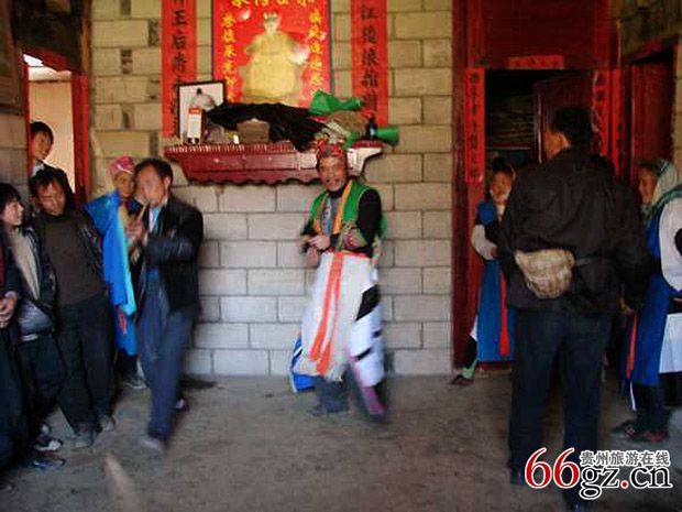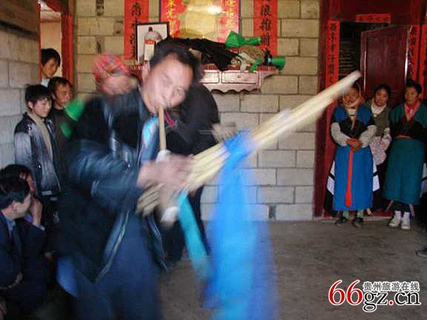 图为2010年1月24日镇宁江龙竹王村干坝欧国兴家供竹王仪式举行摔跤舞实拍