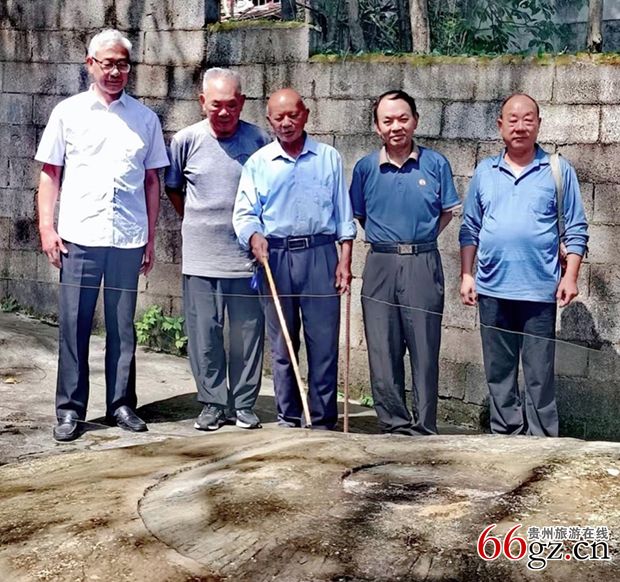 贵州旅游地学专家实地考察“夜郎天书”石,从左至右:刘家仁、王立亭、杨文金、陈跃康、杨德荣现场合影。