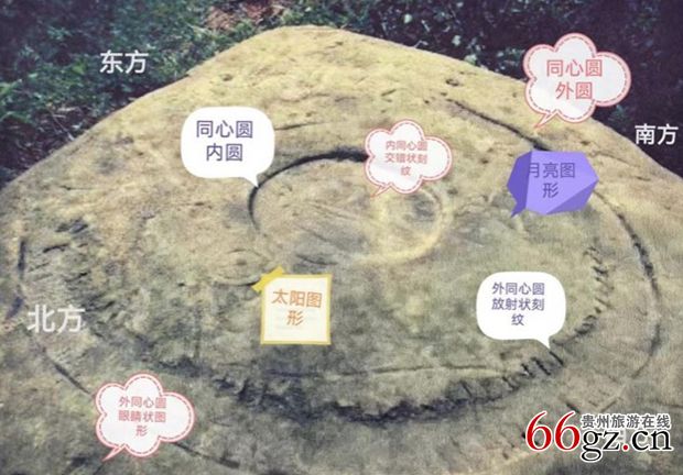 在同心圆的内圆(小圆)的外缘,还有两个小圆。小圆直径约十余厘米,分别位于同心圆的内圆(小圆)西北方位与西南方位。位于西北方位的小圆刻有放射性线条,具有太阳图形的特征;位于西南方位的小圆为一空心圆,具有月亮图形的特征。这两个一阴一阳的圆球,仿佛太阳与月亮在围绕同心圆的内圆(小圆)旋转,十分生动有趣。