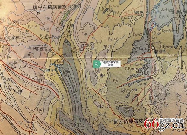 从局部地质构造单元来看,位于镇宁县的本寨向斜轴部。其核部地层为中生界三叠系石灰岩与砂岩,两翼地层系上古生界二叠系地层,“夜郎天书”石岩性为三叠纪系中统石英砂岩,由于硬度较大,当地村民称其为“磨刀石”。