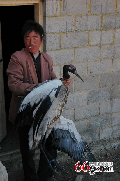 在这里我们认识了这样一位平凡而又不简单的管理员,大家亲切的称呼他为小李。在他的身上有威宁人特有的质朴和憨厚,被高原烈日炙烤的黝黑脸上永远都有一抹浅浅的笑容。我们来到他家时,小李告诉我们有一只黑颈鹤受伤了。看得出来小李对于黑颈鹤的喜爱,言语中满是关爱,神情里流露出不自觉的深邃。在大家的一阵询问下,小李从棚圈里抱出这只黑颈鹤,说道:“它的伤已经养好了,过几天就可以放归自然。”听小李这么一说,大家的心算落了地。