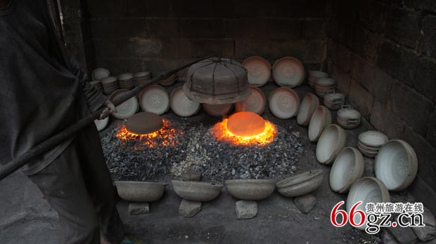 据工匠们介绍,得天独厚的用料和独特的生产流程,令其它类似的产品望尘莫及。织金砂锅主要原料为当地产的白色粘土,无烟煤粉及煤灰,白砂泥。工艺流程从和泥,成坯,上釉到烧炼整个过程都是手工操作。织金砂器成型后自然干燥或烘干,然后在地炉上用大砂缸盖住煅烧,烧成时间极短,小器皿仅需十分钟,大的也只需二十分钟左右,成品收缩性不大,很少变形,一经出窑,用柴火烟熏,呈灰黑色,古朴浑厚。