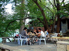 灿烂的阳光均匀的洒落在那一片片错落有致的石头房上,大多数房前的檐柱上都挂着一串串金灿灿的包谷和红艳艳的辣椒串。而其中一些横栏上挂着招牌的风味小酒馆小饭馆则或东或西的散布着,酒是是特酿的糯米酒,饭是风味独具的农家饭。看来,游客的接踵到来已经给镇山村民带来了无限的经济契机。