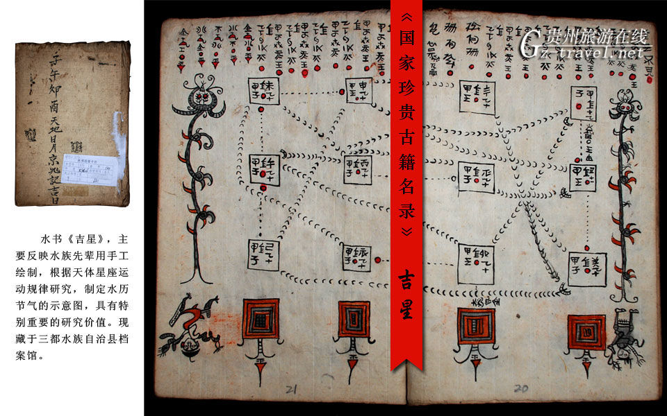 | 水书是迄今世界上活着的象形文字典籍之一,是中国乃至世界文化宝库中罕见的一份遗产。水书被誉为水族的“百科全书”,其内容博大精深,是水族民间知识的综合记录与体现,涉及天文、地理、攻守、出行、伦理道德、工艺美术、农耕渔猎、宗教信仰、历法预测等诸多方面的内容。在水族人民的社会生活中起着很重要的作用,特别是在农事、丧葬、祭祀、营造、婚嫁、出行、节令、占卜等活动中发挥着一种指导规范的作用。水族人民的生产生活、一举一动都要受到“水书”的条例制约,都要依据“水书”择定而行。为此,水书在水族人民的社会生活中有着举足轻重的地位。目前,三都水族自治县档案馆和荔波县档案馆收藏有近2万册的水书古籍。其中,三都县档案馆收藏的《万年经镜》、《六十龙备要》、《吉星》,荔波县档案馆收藏的《泐金•纪日》、《金银》、《庚甲》等六部水书进入国务院颁布的首批《国家珍贵古籍名录》。 |