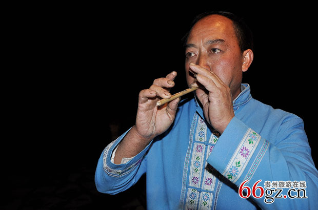 贵阳市乌当区偏坡乡布依族村民正在吹奏姊妹箫