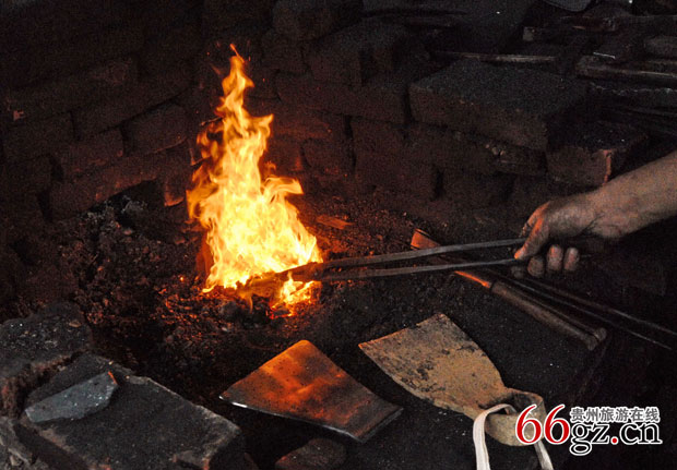 在贵阳的朱昌镇,每逢赶场天,镇上唯一的铁匠铺总是围滿了前来加工或修复小农具的村民。张铁匠把烧红的铁器放在砧铁上,手里拿着铁锤叮叮当当捶打着器具,飞溅的铁花,像绽放的礼花美丽无比。欢快的铁器撞击声和着有节拍的捶打声,像动人心弦的交响曲。有时张铁匠和助手一来一往轮翻抡锤,很快就将铁块打成需要的形状。最后一道程序是“淬火”。张铁匠将烧红的铁器放入水中时,随着“哧啦”声,一件铁器就完成了。围观的村民有的还时不时帮着张铁匠抡两锤,过过当铁匠的瘾。张铁匠说:“世上三样苦,撑船、打铁、卖豆腐”,以打铁为生的张铁匠一天下来累得腰酸背痛。
