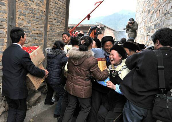 好不容易过了对歌喝酒这一关,便如释重负抱着礼品兴冲冲前行,未料想迎面来了众多接礼的人们,满以为是帮忙抬礼品的,谁知竟是抢礼品的。一声吆喝,顿时叫声、笑声四起,你争我夺,推来攘去,乱成一片,好不热闹。一刹那所有的礼品被抢走,摆在院子里准备晚上酒席用的园桌上,高声叫卖,宛如一个礼品拍卖会。