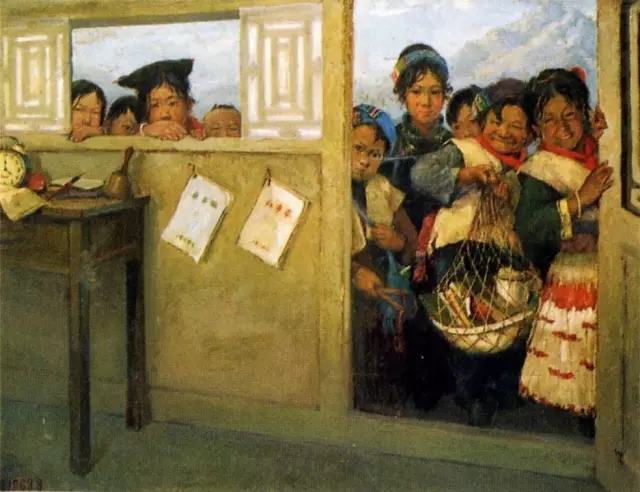 自1955年起,新中国培养的第一拨油画家陆续莅任贵州,如潘迎华、李自由、陈宁康、川康、刘星源、邓刚彦等,他们在前苏联“社会主义的现实主义”理论框架中,从事着早期油画的实践与探索,创作出了我省第一批具有鲜明主题思想和浓郁民族特色的油画作品,如《芳芳》、《看望》、《苗家地方花一样》、《秋夜之春》、《春耕》等。这些作品分别在1950年代的“贵州省首次青年美展”和1960年代的“贵州省第四届美展”上面世。此间诞生了我省建国以来最早具有全国知名度的两幅油画《我们的首都北京》(潘迎华作,见图2)和《新来的老师》(李自由作,见图3)——前者获“贵州省首次青年美展”一等奖,并入选当年的全国美展;后者入选“第四届全国美展”后,被中国美术馆收藏。
