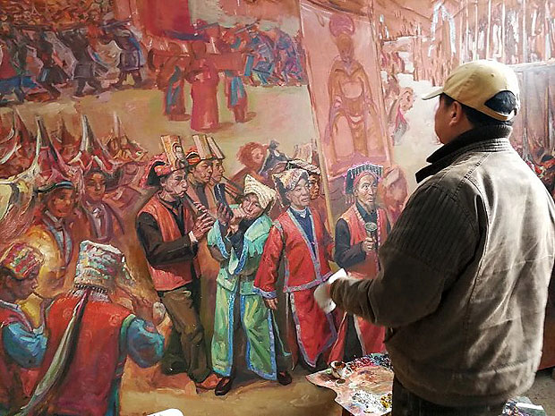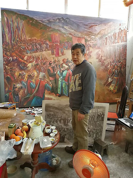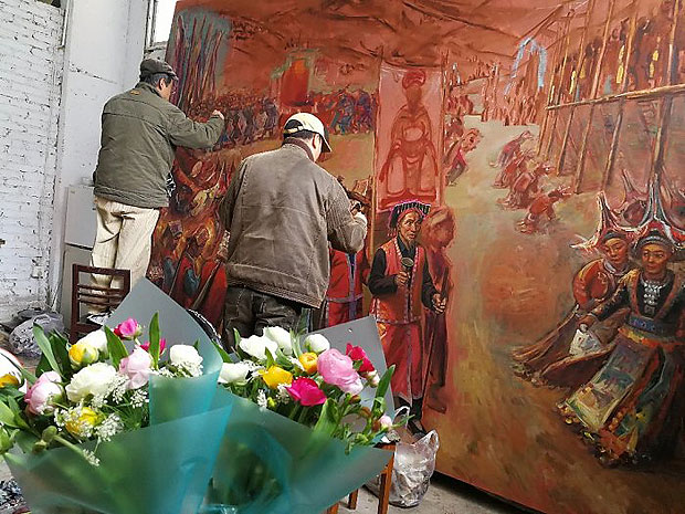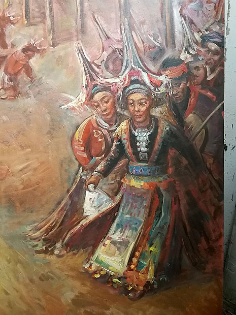 回贵阳几天里,天天都泡在隔壁陈红旗老师的画室欣赏他和刘力老师共同正在创作的《瑶族盘王节》巨幅油画作品。从去年7月份开始,陈红旗老师和刘力老师就已经在开始构思创作这一巨幅油画作品,并前后几次亲自到了从江的瑶族村寨采风、收集素材,了解瑶族的民族文化和习俗。勤奋执着的陈红旗老师和刘力老师每天上午10左右就会到画室,一直工作到晚上六七点钟才离开画室。该巨幅油画作品正式开始绘制两周多时间,计划将于今年五月份完成。